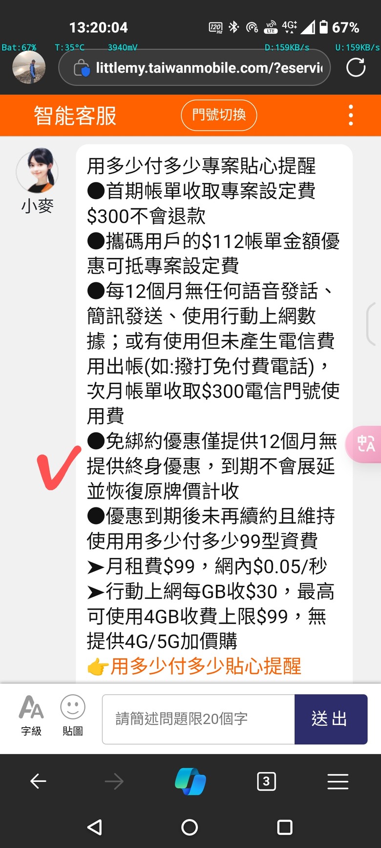 只有通報12/8起網內沒有優惠費率了沒有月租費減免99是否還有的說明。最高收費上限99也是模糊不清。和原合約衝突…..等12月跟1月出帳即可知曉這筆投資算打平🤣。預付卡小管家跟簽到2年回收約300元+測出家中台哥大訊號最優。剛好打平300元開通費,預繳卡了300在裡面。