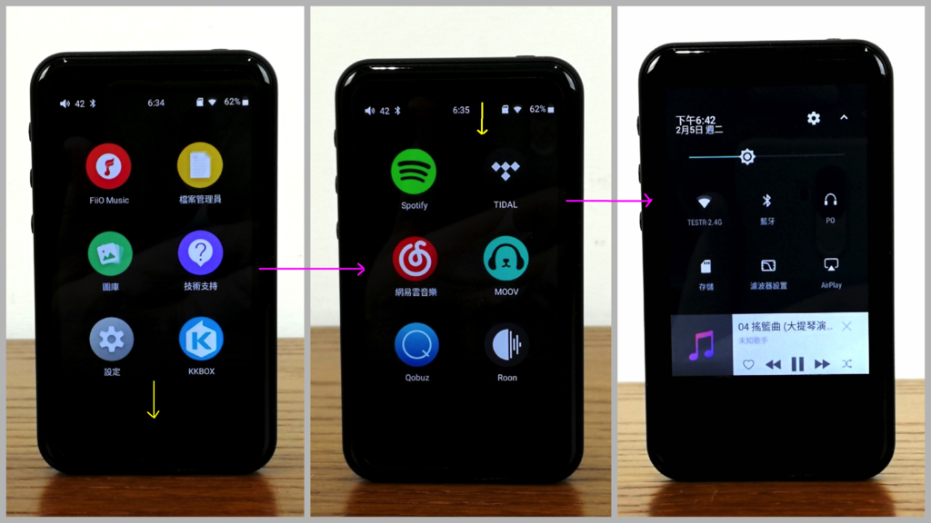 主畫面除了FiiO music 音樂播放器, 還可以安裝各種白名單的第三方音樂App, 像是常用的KKBOX、 Spotify等等。