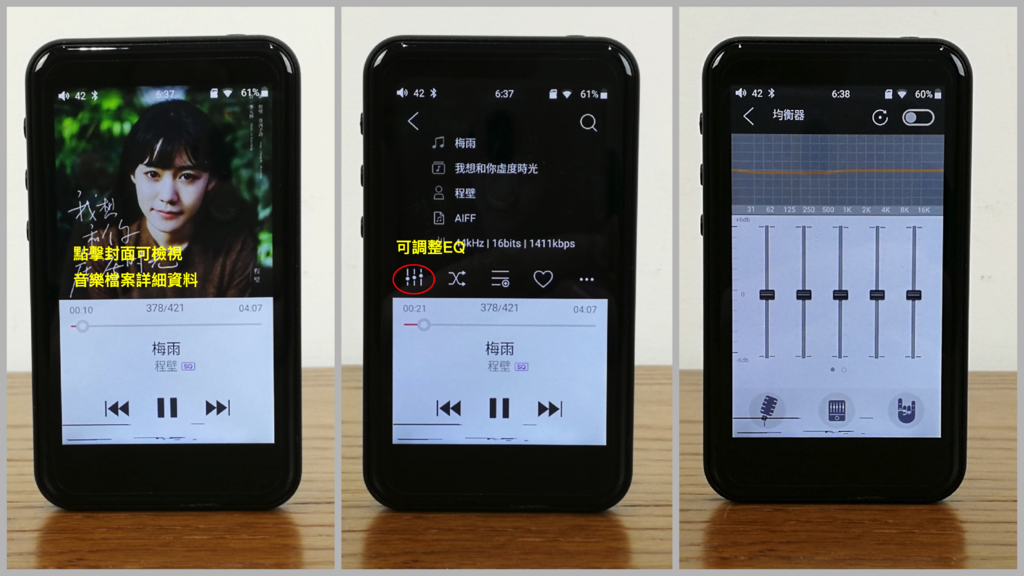 音樂播放過程, 點擊封面 可以檢視音樂的詳細資訊, 下方的快速工具列可以選擇 音樂的播放模式,也可以調整EQ。