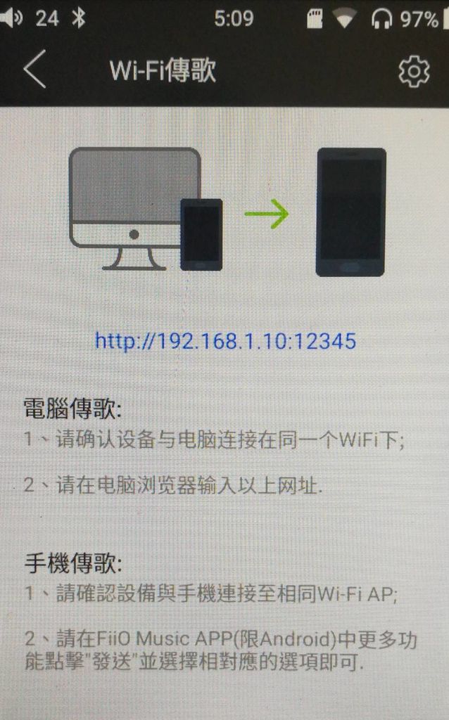 從設定中開啟Wi-Fi傳歌功能後,就會出現一個導引畫面,會顯示FiiO M6目前內部網路的網址。