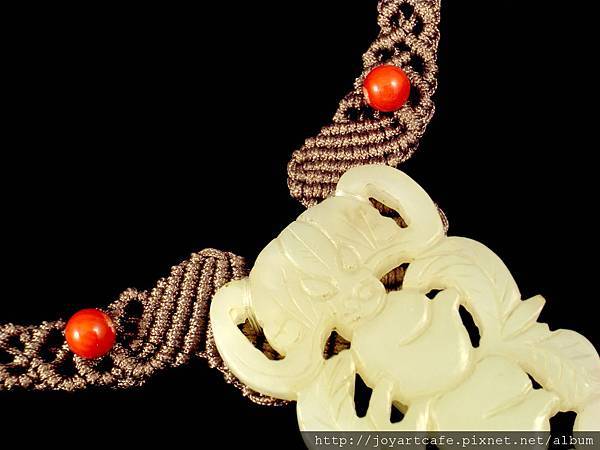 設計師以兩顆紅珊瑚珠作為點綴,與主體本身的凝脂透亮相互輝映