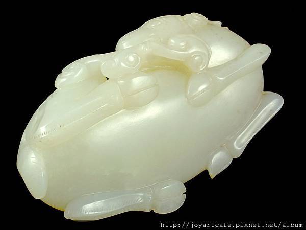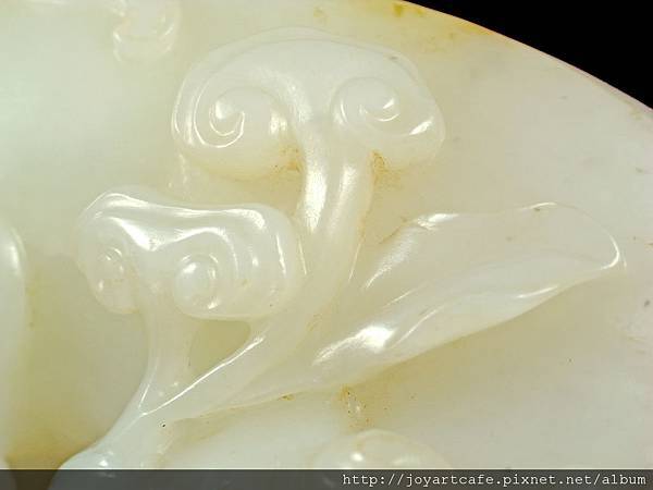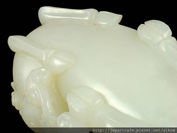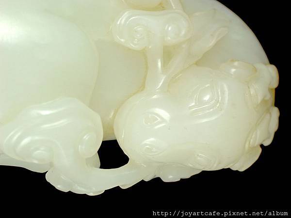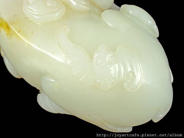 白鹿口銜靈芝,已是吉兆的象徵,而白鹿背上還有一隻蝙蝠,代表福祿壽兼具,此件作品油潤天生,玉料堪屬上乘,工藝質樸,令人愛不釋手。