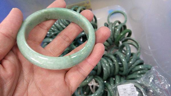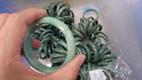 進去看到旁邊有放一堆翡翠手鐲,看起來水頭明顯很乾,且含有很多雜質。