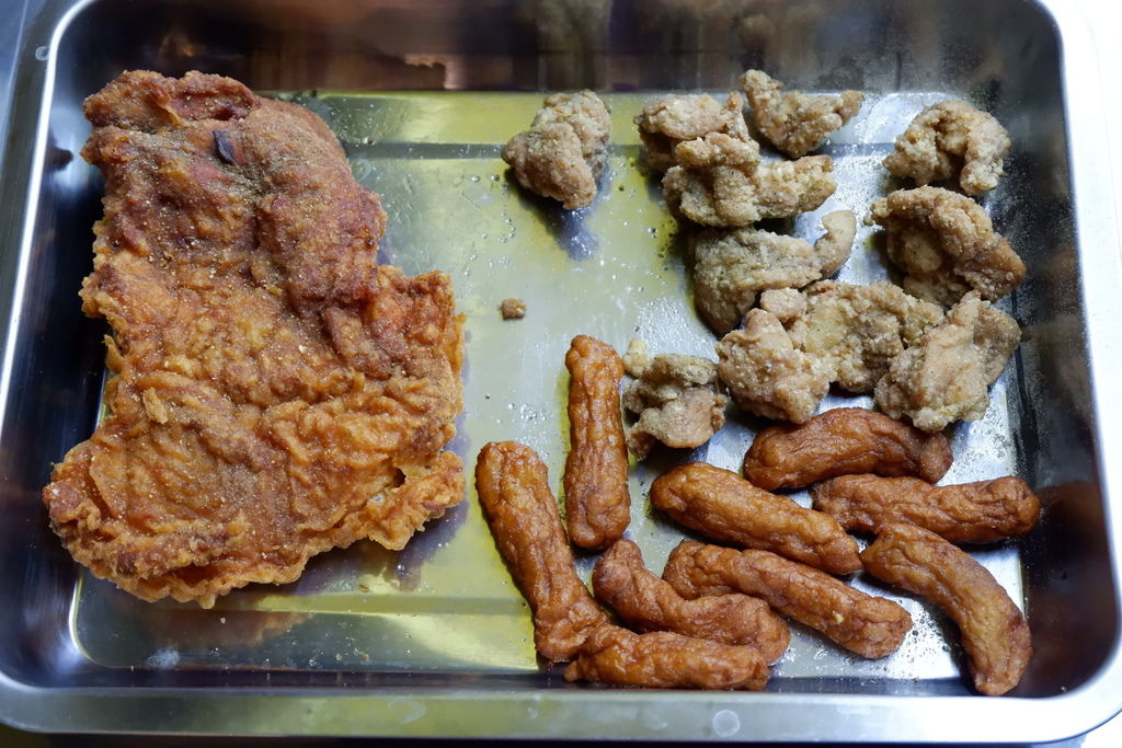 左為超大雞排,雞軟骨(右上),招牌甜不辣(右下),這些都是招牌必吃必點的美食,撒上海苔與胡椒鹽醃製過的G軟骨,酥中帶脆又有咬勁,無論是搭配啤酒或可樂飲料都很對味!