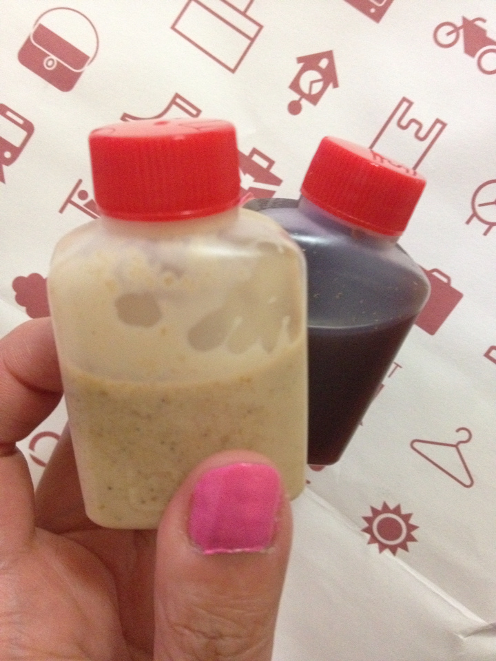 更貼心的是,店家不只幫我們打包這一大塊豬排,還補了生菜,兩種醬料也裝在小巧可愛的瓶子內。雖然回到家了,我覺得我還在靜岡勝政享受呢!