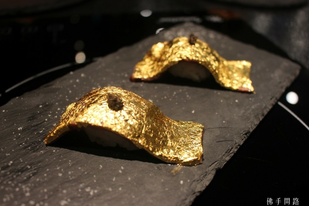 接下來是超級驚人的金箔和牛壽司,上面放了松露,金箔下面是和牛壽司入口即化超!奢!華呀!