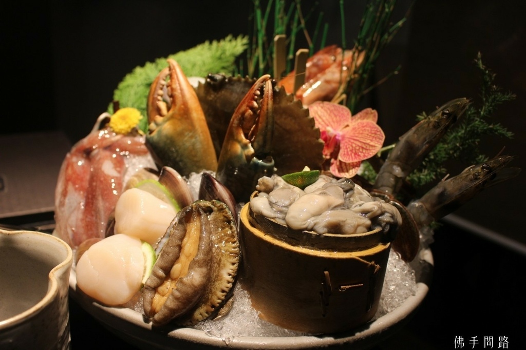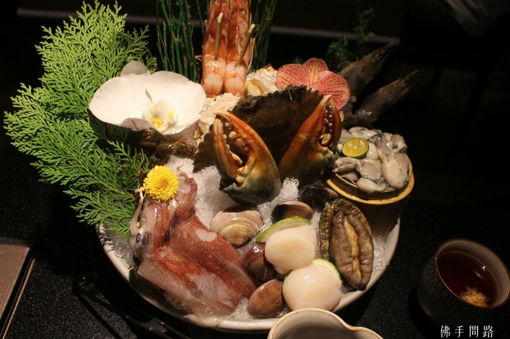 海鮮盤超級華麗澎湃!!! 涵蓋不少高級食材,師傅半夜自基隆崁仔頂魚市挑選,有沙公、鎖管、干貝、蛤蜊、藍鑽蝦、天使紅蝦、鮑魚、牡蠣,兩種蝦都很新鮮Q彈,鮑魚還會動咧!