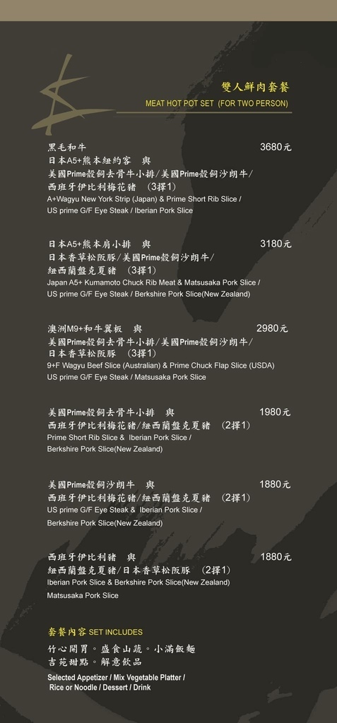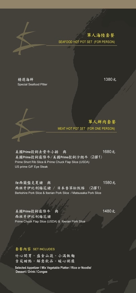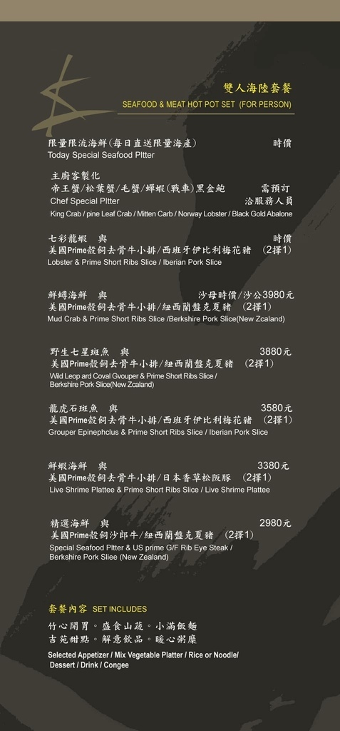 這次用餐我們選擇的是雙人海陸套餐,鮮蟳海鮮(沙公)與美國Prime榖飼去骨牛小排套餐,(也另可選紐西蘭盤克夏豬搭配)套餐內包含了竹心開胃。盛食山蔬。小滿飯麵。吉苑甜點。解意飲品。暖心粥糜。