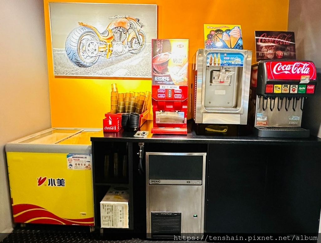 飲料吧有"可口可樂、無糖可口可樂、美粒果蘋果汁、美粒果柳橙綜合果汁、雪碧、檸檬紅茶",6 種冷飲;還有"醇品拿鐵、立頓奶茶、杏仁茶、阿華田",4 種熱飲,免費無限暢飲。冰淇淋的品牌是大眾化的"小美",提供 4 種口味,還有"客惟您"低脂、低糖、高鈣霜淇淋,也是任你吃到爽。