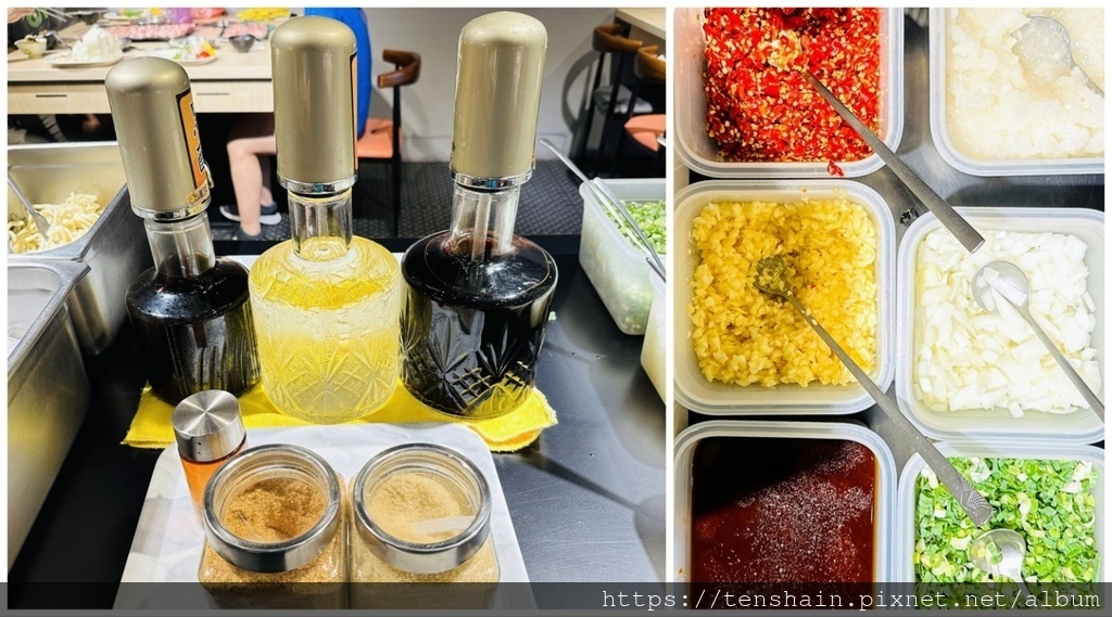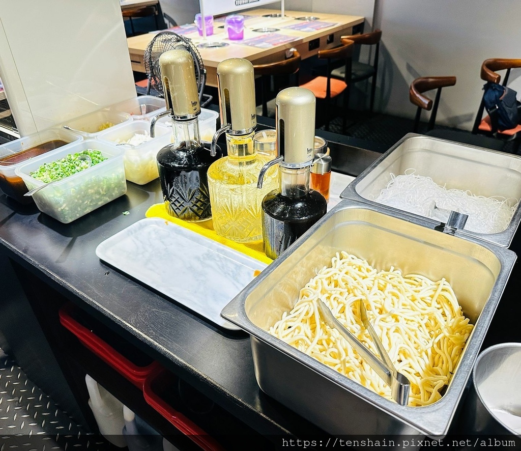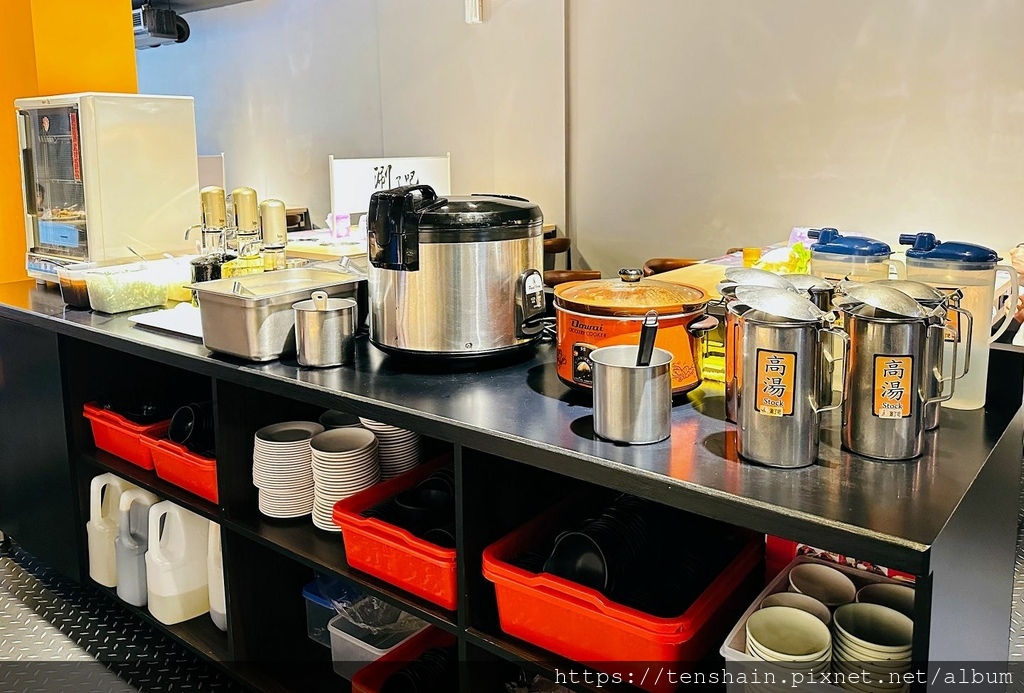 走道中間有個餐台,由左至右,我們來看看。最左邊是有烘乾殺菌功能的烘碗機,餐具在裡面,需自取。再過來是醬料區、麵飯區、最右邊是高湯。