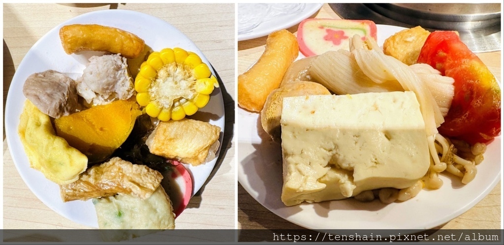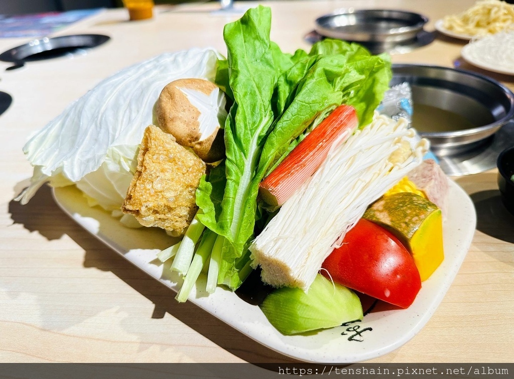 看看這個菜盤是不是份量十足?"白菜、高麗菜、金針菇、牛番茄、香菇、南瓜、胡瓜、芋頭、玉米",蔬菜就有 9 種,還有各式火鍋料,豐富的不得了!