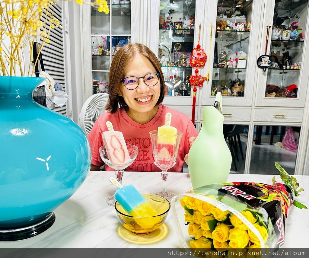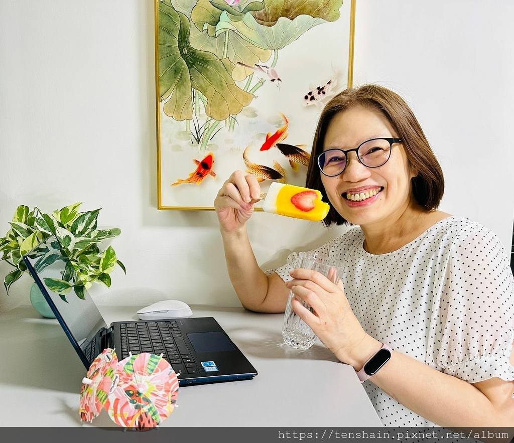 家裡有了這麼多誘惑人心的美味冰棒,任誰都會隨時找理由吃一支。這天老婆拿著筆電在追劇,眼睛很忙碌,手也沒閒著,左手杯子裡不就有一支"盛夏果實"嗎?