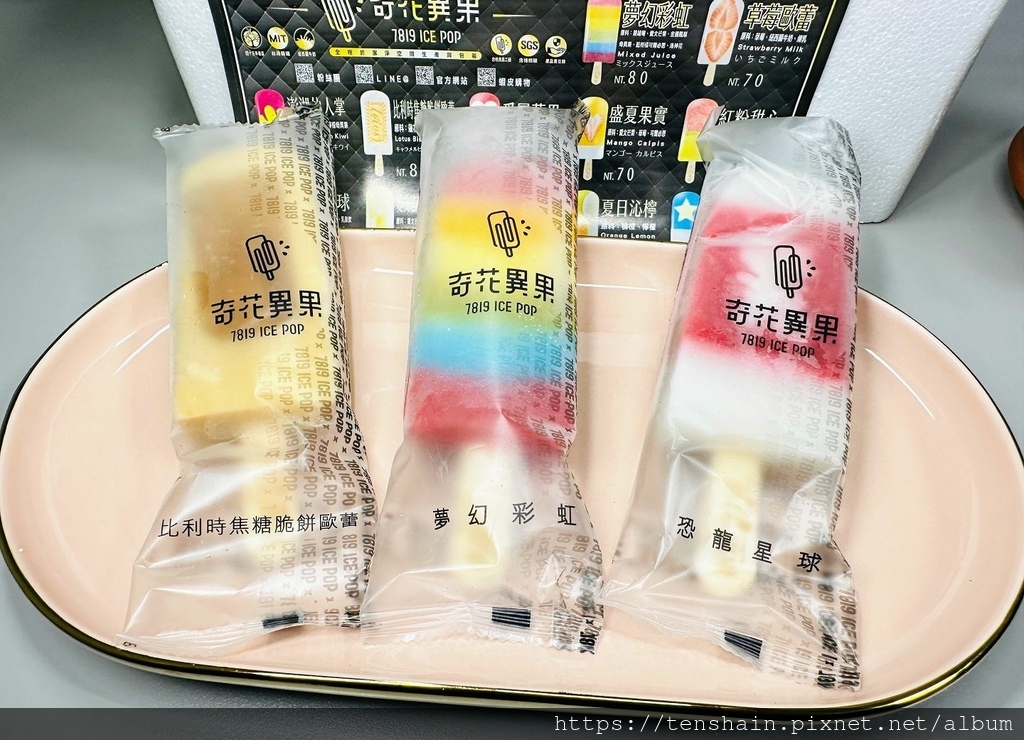 最後三種是"比利時焦糖脆餅歐蕾、夢幻彩虹、恐龍星球",另外贈送的三支冰棒,則是萬年不敗款:"愛文芒果、金鑽鳳梨、麋鹿庫"。