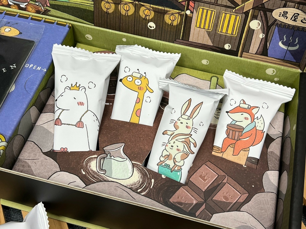 4.蛋捲獨立包裝年節分食超方便,上頭還有可愛小動物,大小朋友都會很喜歡!放在口袋也很好攜帶,隨時都能享受苦甜交織的饗宴!禮盒還贈送特製香氛片,開箱的時候充滿驚喜~