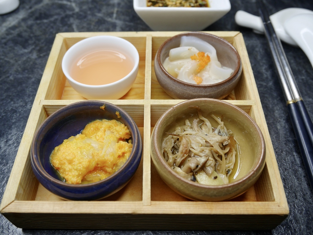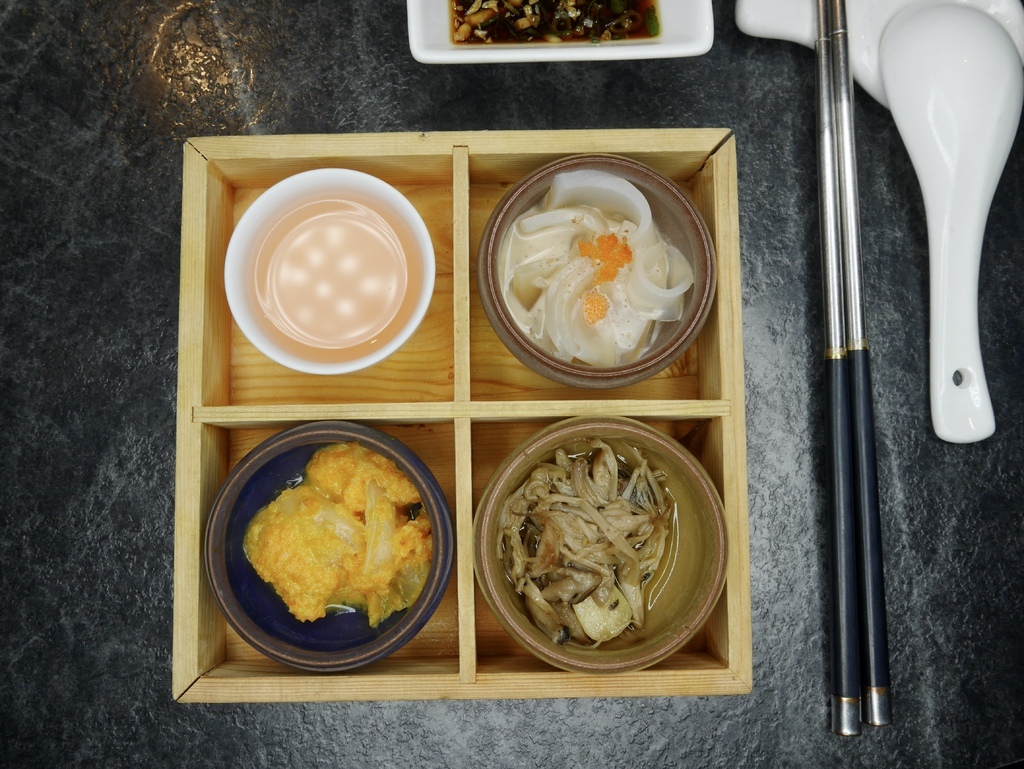 香氣十足的蒜味油漬菇和清新爽脆的黃金泡菜。