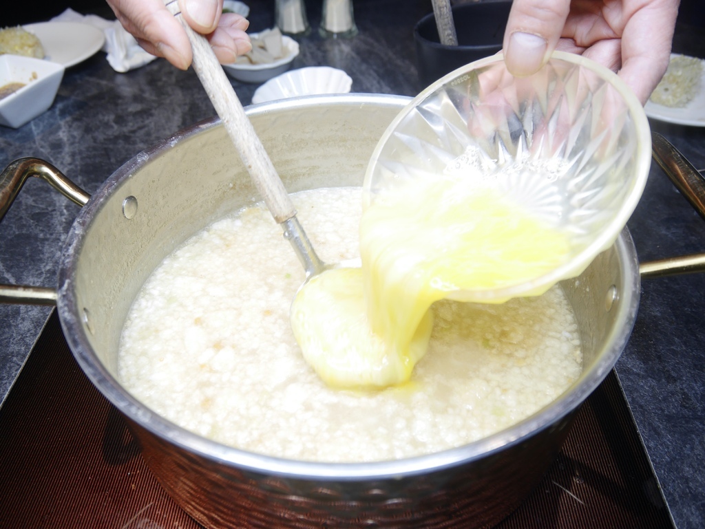 將匯集滿滿蔬菜和肉品精華的雞湯底熬煮成粥。