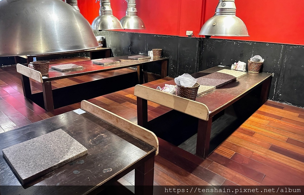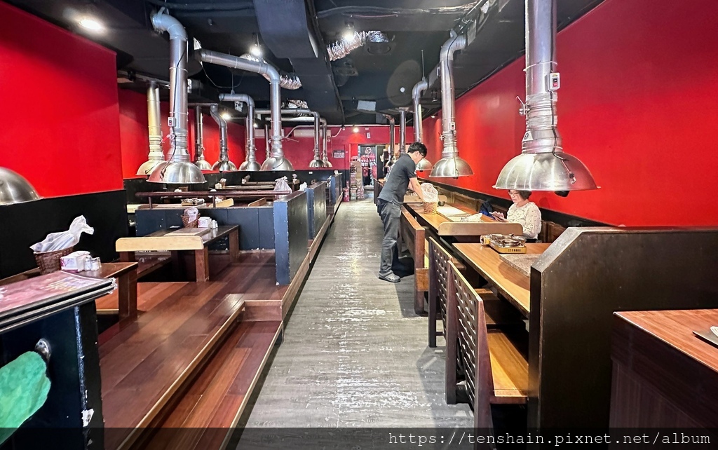 店裡是典型的日式簡約裝潢,沿著大門的延伸軸線,採用左右不同的座位設計。每張桌子上方都有一個巨大的抽風機,抽煙效果極好,音量卻低到幾乎聽不見,兩個小時吃完,渾身不沾一絲炭火味,真的很厲害!