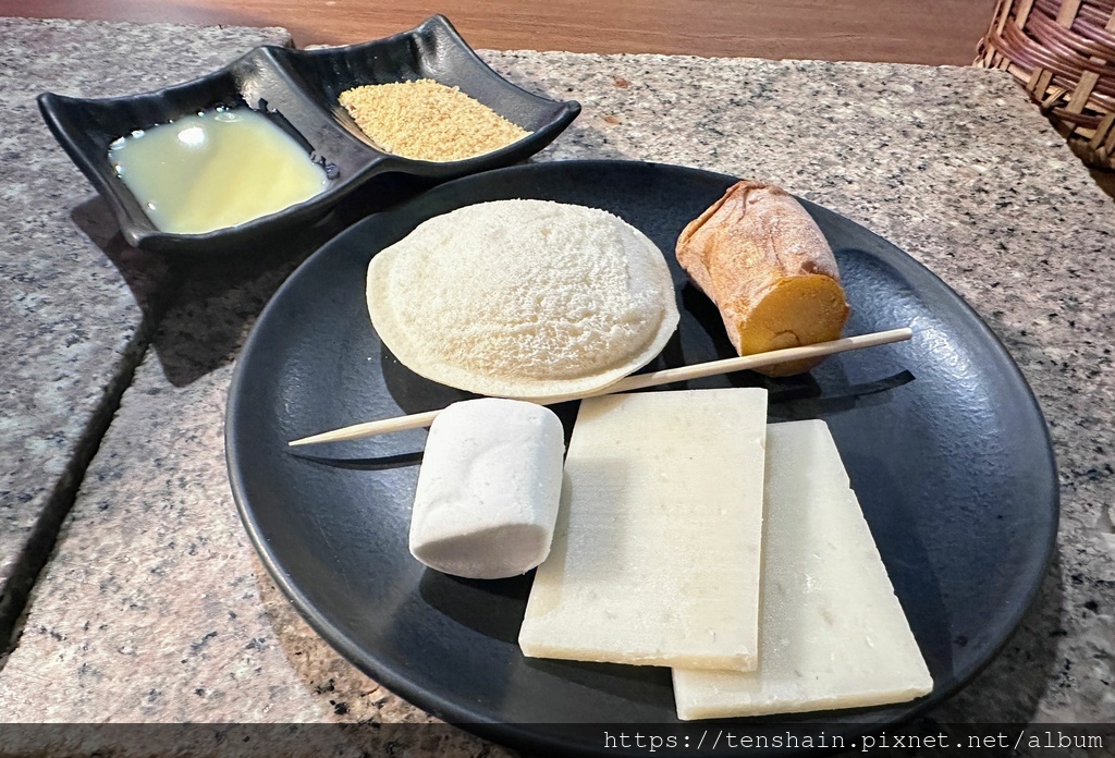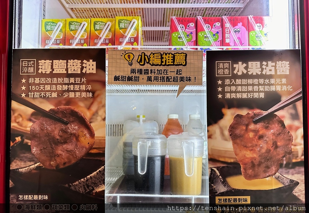 沾醬有兩種,"日式薄鹽醬油"搭配"海鮮類、火鍋料、蔬菜類"最對味;"水果沾醬"配"厚切肉類、雞肉類、蔬菜類"清爽解膩。不過,店長建議兩種醬混在一起,鹹甜鹹甜的滋味,百搭!