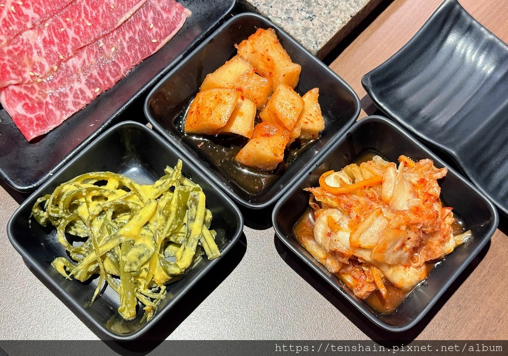 小菜我們點了三個:韓式泡菜、翡翠海帶絲、辣蘿蔔,每一種都很好吃。單吃沒問題,包肉吃更讚!