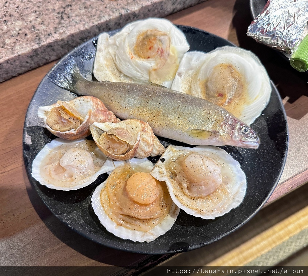 我們吃得興起,店長建議再來一盤不同的海鮮,這次出場的有"半殼扇貝、翡翠螺、京都香魚、深海粉絲貝"。