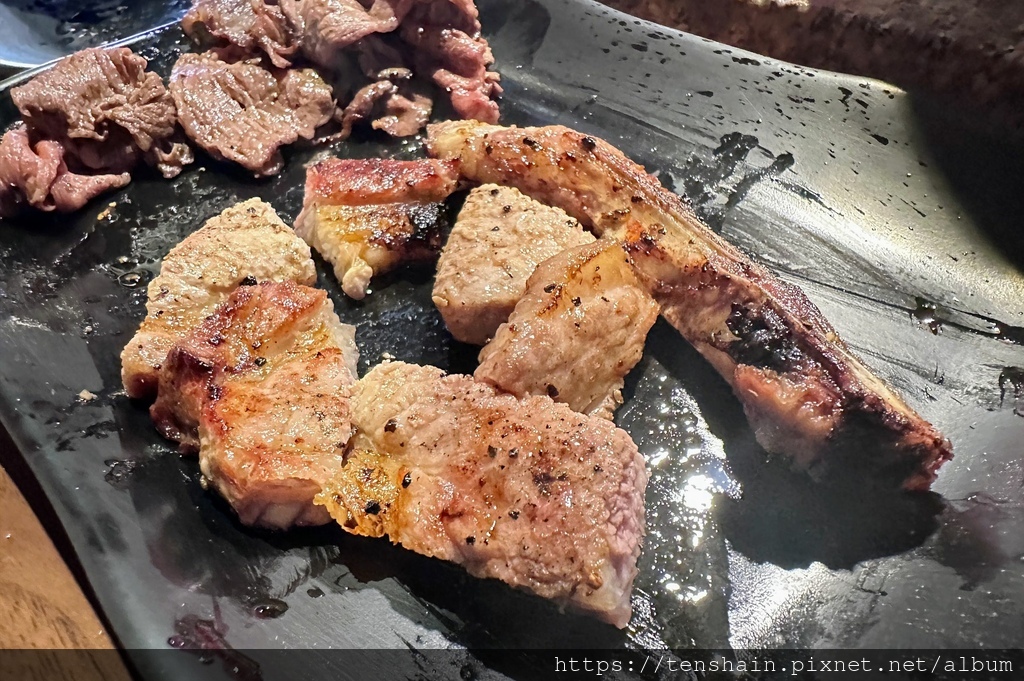 這一盤很豐富,左下是"霜降豬",右下是"伊比利松阪腹肉",上方則是"戰斧豬排"。