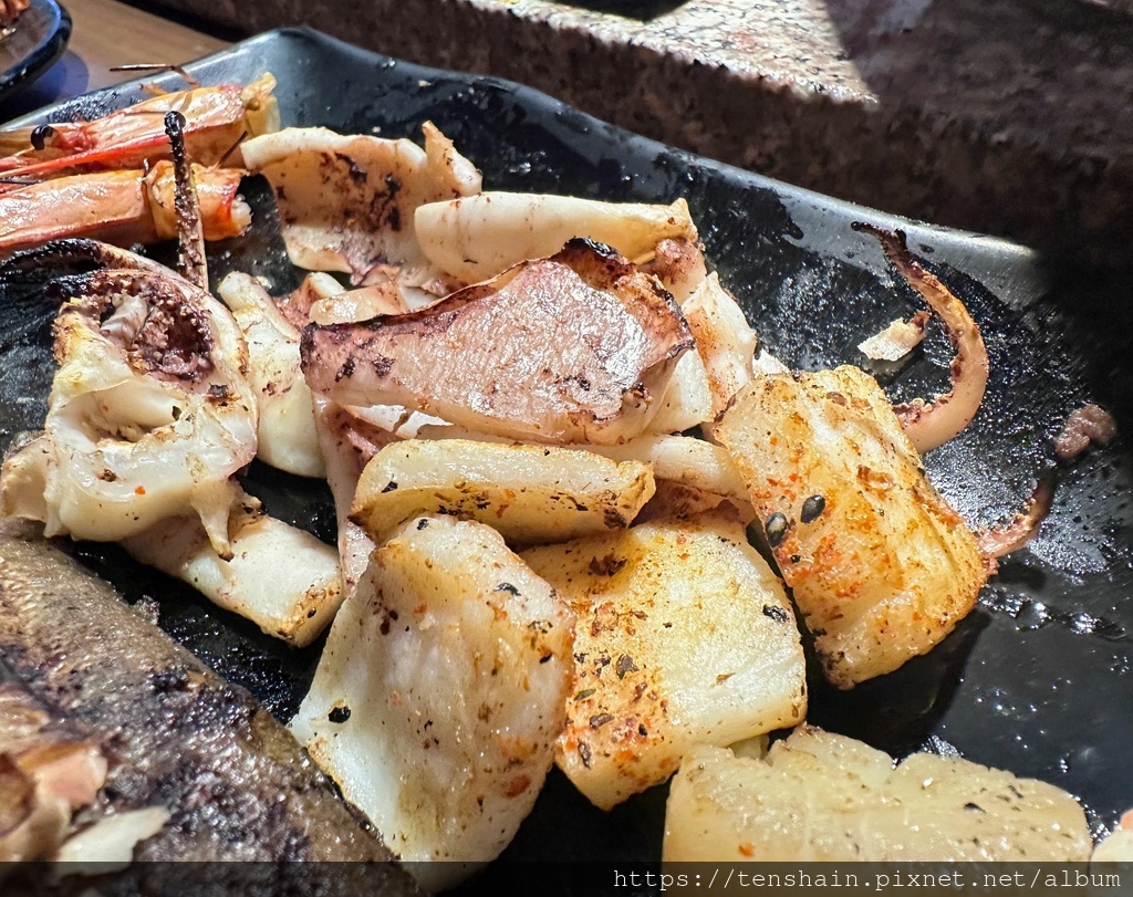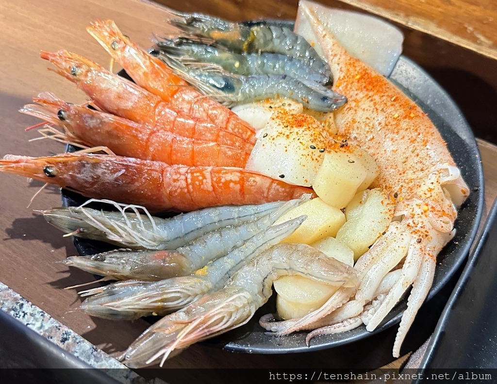 「豚野日式炭火燒肉」不只燒肉好吃,海鮮更是精彩,正對了我這個海鮮控的胃,那就先來一個海鮮盤吧!"白蝦、天使紅蝦、草蝦、白玉干貝、鮮花枝、阿根廷魷魚",六種海鮮擺得整齊又漂亮,這就叫「秀色可餐」。