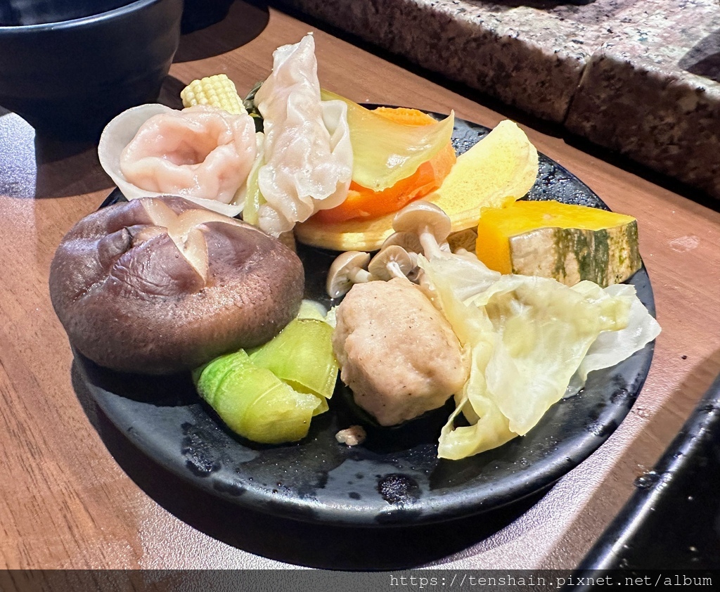 「豐火野豚鍋」內容豐富,有"魚餃、燕餃、蛋餃、小貢丸、魚包蛋、金針菇、絲瓜、季節時蔬"。