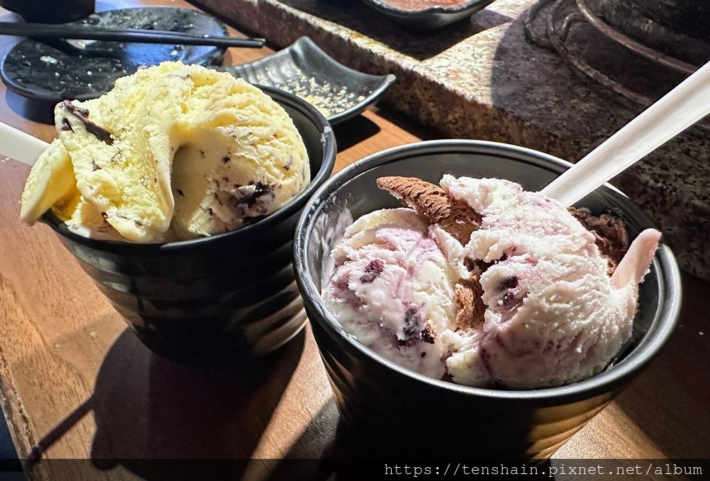 日式燒肉店裡的冰淇淋,當然也要日本口味才速配,明治冰淇淋一次給 10 個口味:"北海道牛奶、巧克力、抹茶、草莓、瑞士巧克力、芒果、香草、OREA、哈密瓜物語、薄荷巧克力",口味多到讓我選擇障礙症發作,是近年來吃過同類店家的第一名!值得一提的是,冰淇淋的軟硬度維持得恰到好處,很好挖又不會太容易融化,很貼心!