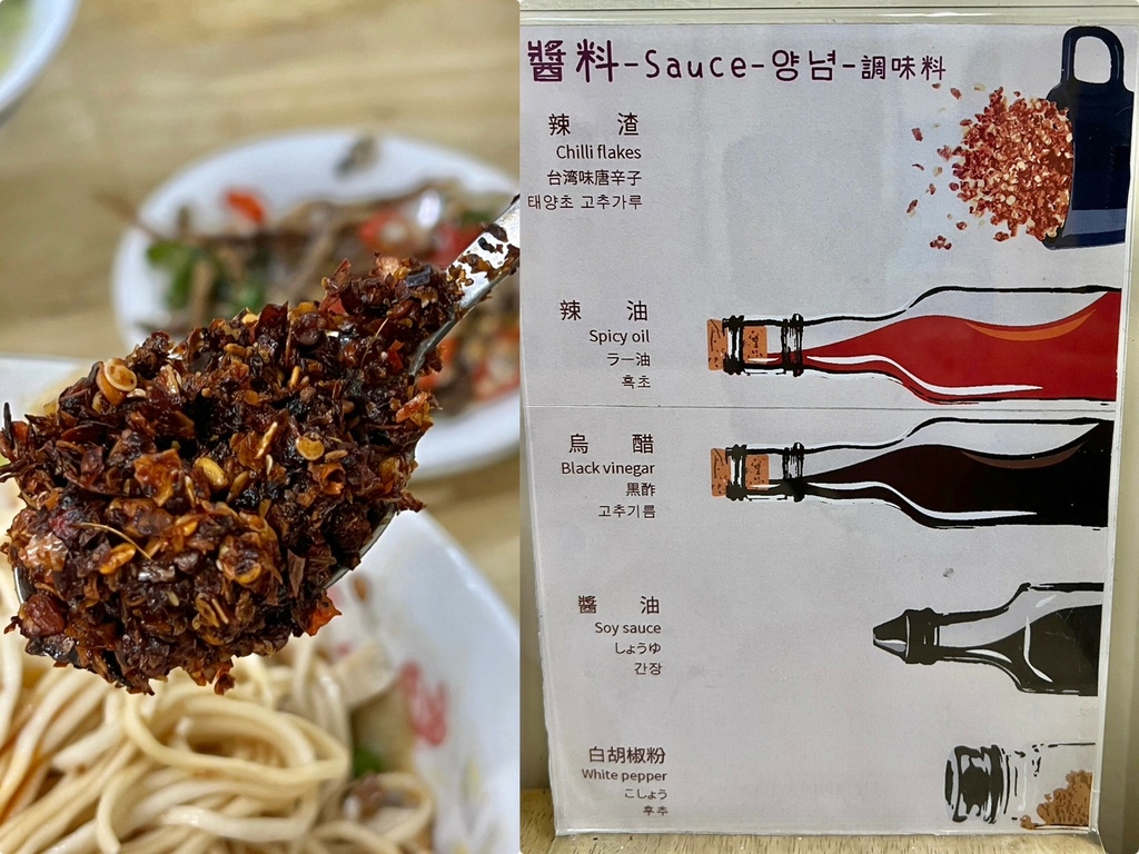 除此之外還要加辣油、烏醋、胡椒、醬油等增添風味,辣油可以增加麵條的滑順度、烏醋跟醬油提升鹹酸度,胡椒、辣油、辣渣提升香氣
