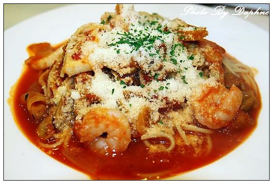 最驚人的是有新鮮的三大顆蝦子 三大片花枝 一般簡餐店套餐的義大利麵 有的料還比這盤虛耶