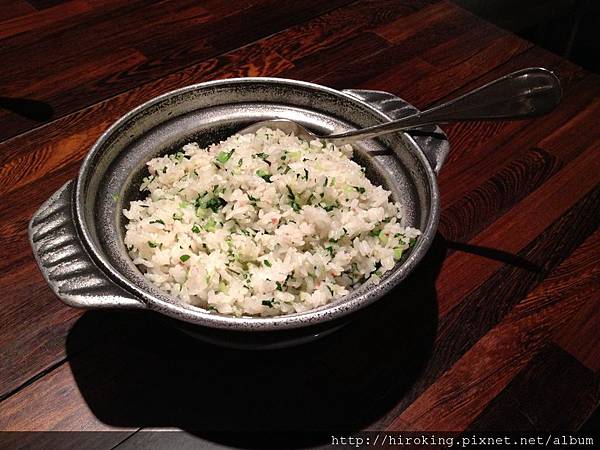 上菜囉!出餐的速度很快,或許是週一晚上客人較少的緣故,從點餐到開始出餐約莫是5分鐘左右,這道是「雲腿青江菜飯」,使用悶煮的方式烹調,加上火腿與青江菜,吃起來有股淡淡的清香,口味很淡很耐吃,建議上桌前可先單吃半碗,品嚐一下簡單食材的細膩風味