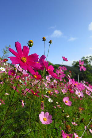 不知何時,在這兒種了一大片的波斯菊,看著他們隨著春風,搖曳生姿,心情也好春天喔!