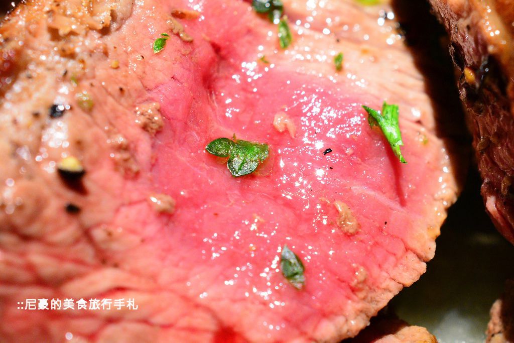 鮮嫩欲滴的粉紅色五分熟牛排,入口即化,忍不住一口接一口