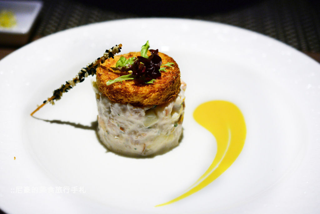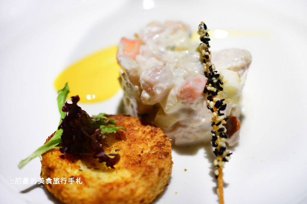 這道開胃菜是雞肉香芋蘋果塔,一旁的醬料則是清爽的優格水果醬