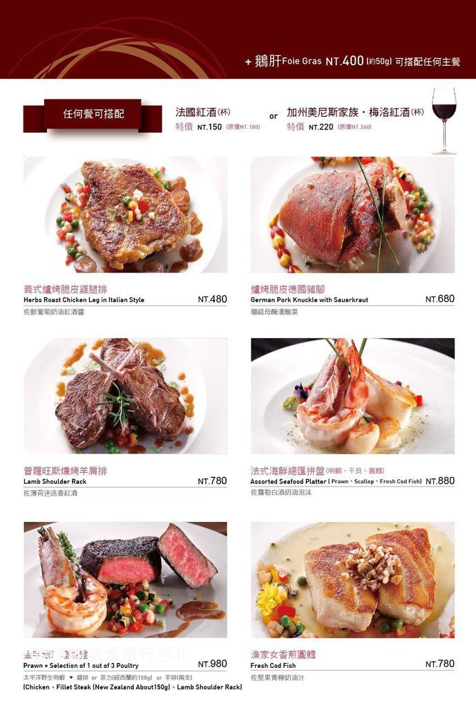 如雞腿排、德國豬腳、羊肩排等等,也有海鮮類的餐點