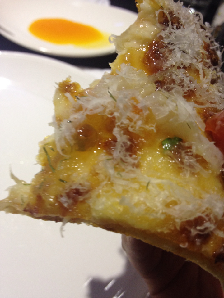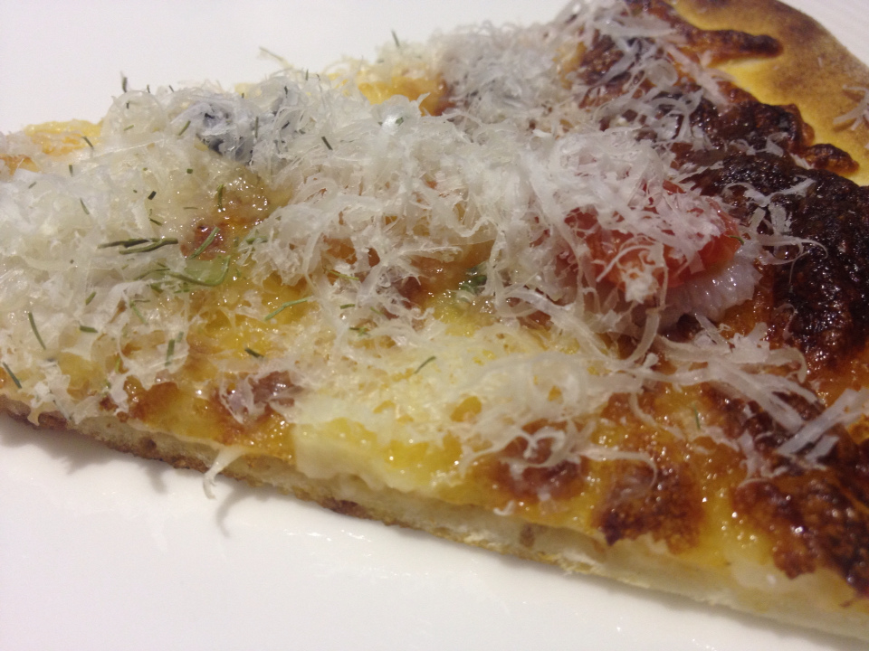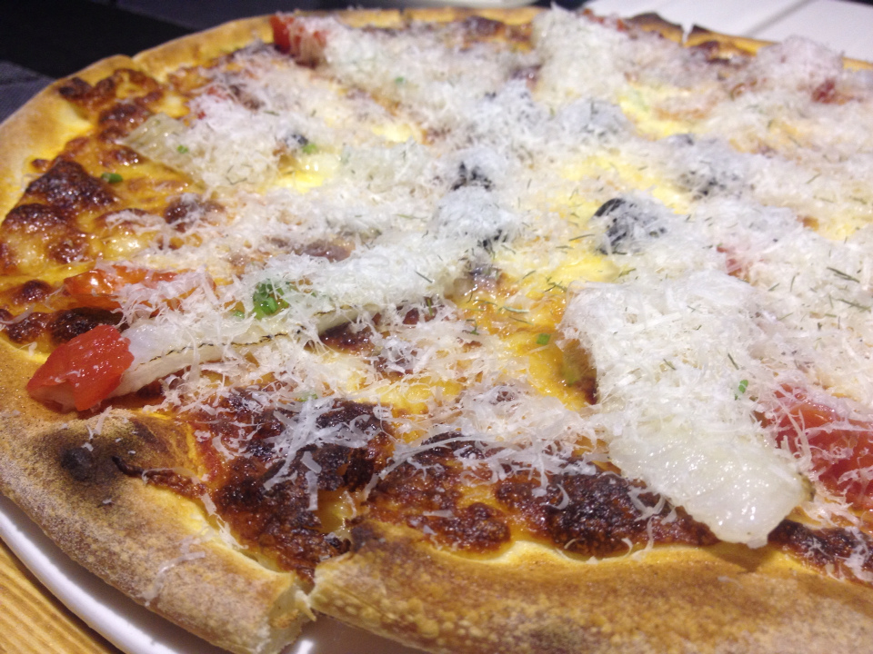 薩丁尼亞海鮮pizza主要有比目魚鰭邊肉、鮭魚卵、帕米吉亞諾乳酪。 我對比目魚鰭邊肉的喜愛源自於南港小高玉第一次吃到比目魚(炙)握壽司,跟原本心目中的第一名: 鮭魚齊名,因為他們都有很濃厚的脂肪香。(鮪魚對不起,我怎麼吃你就是吃不懂/_\)
