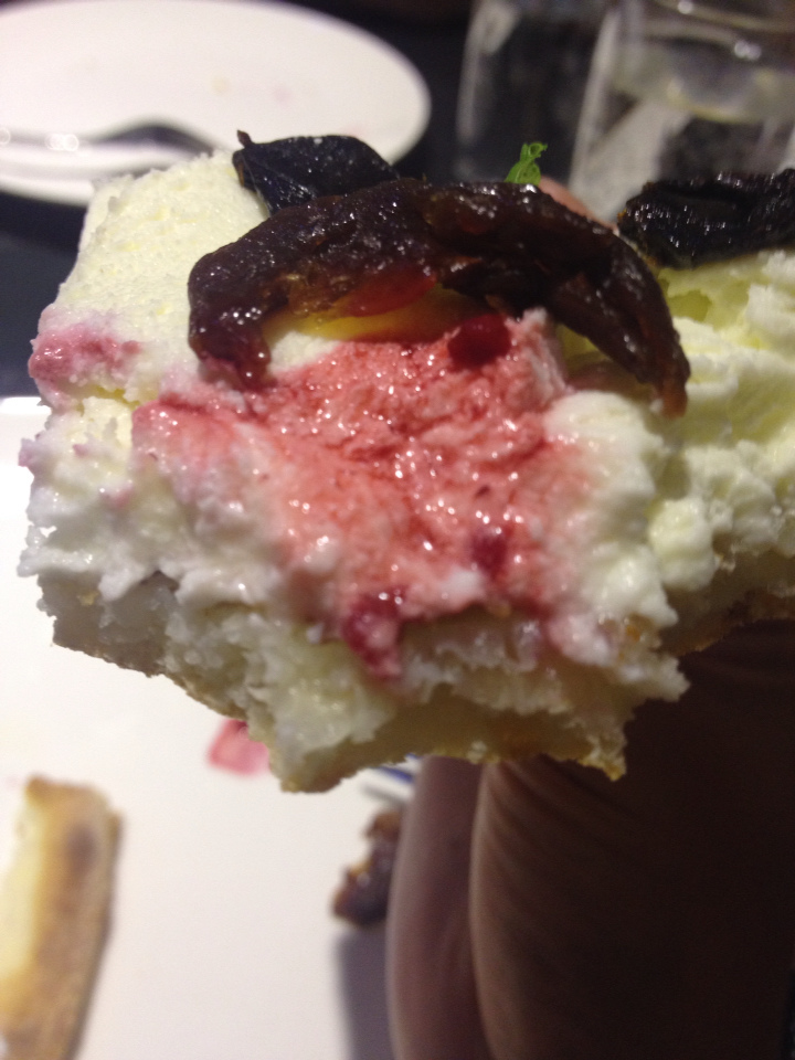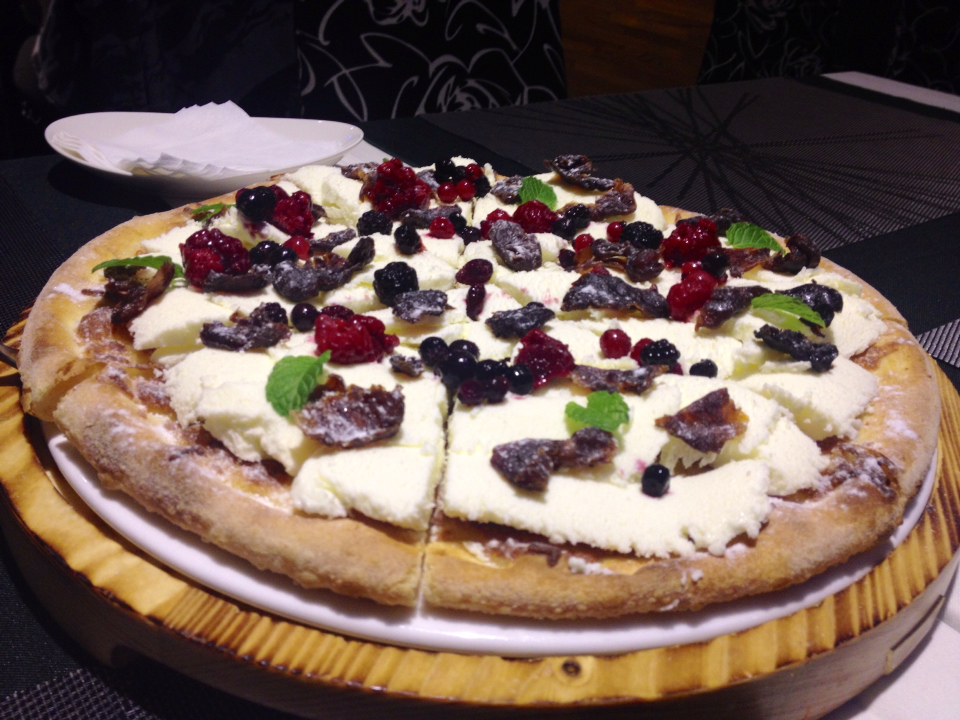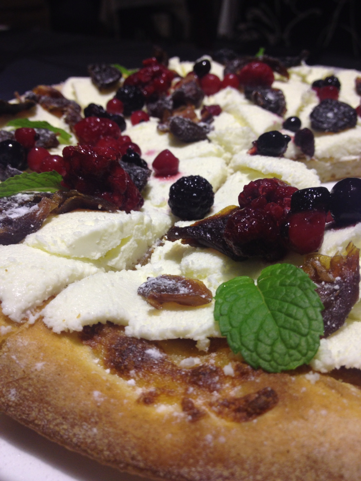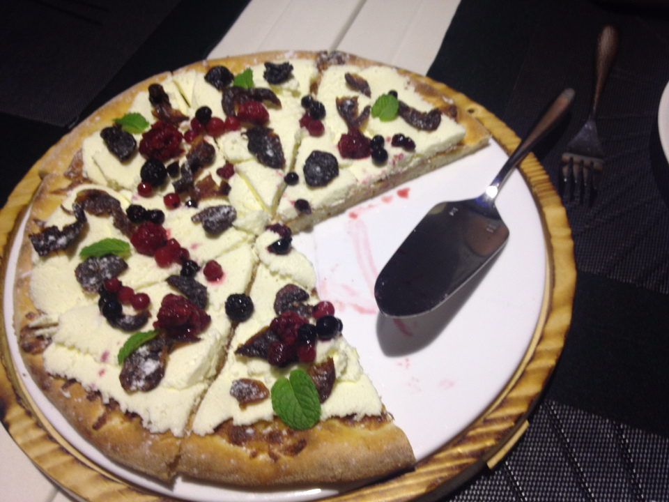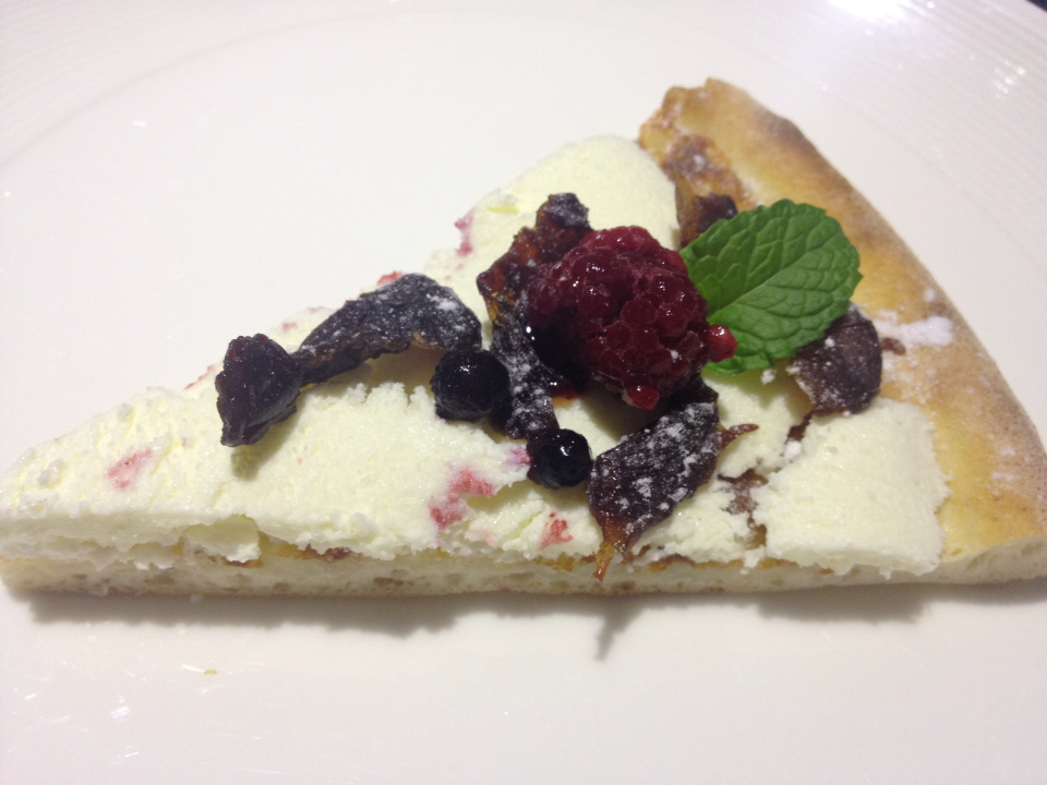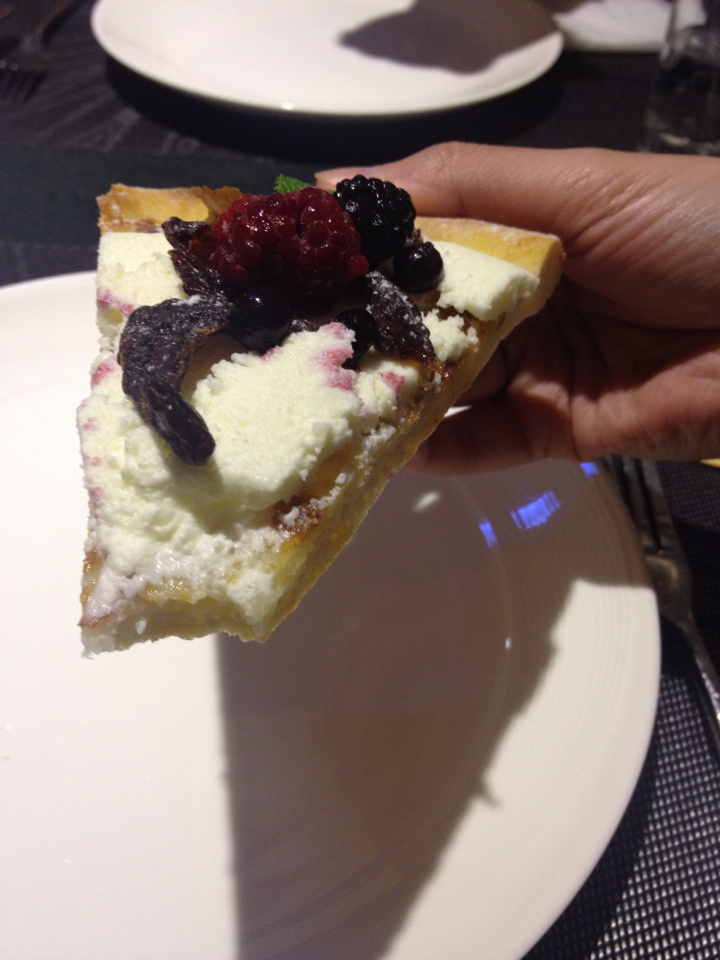 這一個pizza有起司的微鹹、甜鮮奶油的牛奶香、莓果的微酸、貴妃果的甘甜、跟餅皮的麵粉香,口味上豐富而和諧,跟英式下午茶一樣華麗。