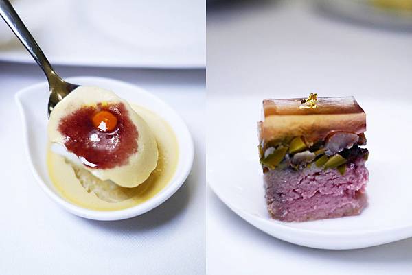 左邊是茴香炒軟後,加上海膽、蛋、波特酒一起去蒸熟;右邊是鵝肝經過酒漬後蒸熟,中間是開心果,最上層是粉紅香檳凍,鑲上一點金箔,一開始的開胃菜就讓妞媽充滿驚艷!!非常期待後續的美味佳餚