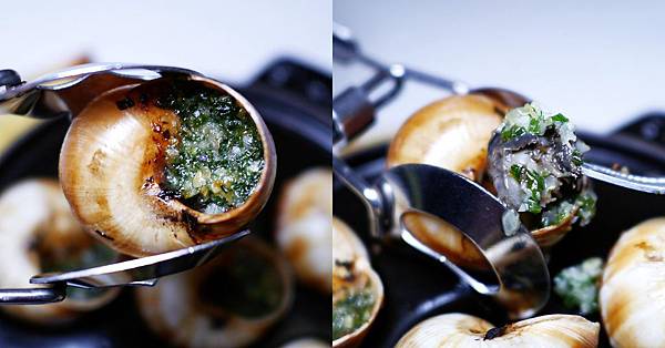 焗烤勃根地蝸牛,跟波爾多蝸牛料理不一樣,波爾多是用切碎的蝸牛肉和蘑菇去炒,勃根地蝸牛料理是用整顆燙熟的蝸牛,去掉內臟後用蒜蓉和巴西利調味後進烤箱烤~