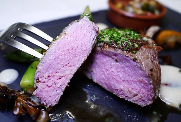 爐烤澳洲小牛菲力、煎牛髓,犢牛搭配鴨肝和煎牛髓,佐檸檬紅蘿蔔泥,因為犢牛肉質軟嫩,但牛味較清淡,因此搭配牛肉味濃郁的煎牛髓可以吃到濃郁的牛肉味和軟嫩的牛肉,