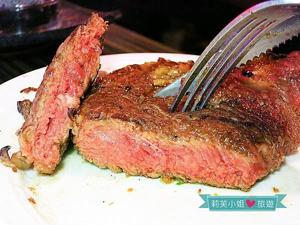 香煎到五分熟的肋眼牛排,適合喜歡吃比較生的客人,像我愛吃七分熟的話,拿靠近鐵牌底層的肉最剛好。覺得這樣的擺盤非常貼心,尤其冬天來吃得話,也不用擔心牛肉會冷掉。