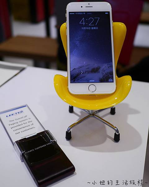 這張迷你座椅是手機座,可以直接將手機放在上面看手機或追劇都可以;旁邊是通知餐點做好自行去取餐的通知鈴