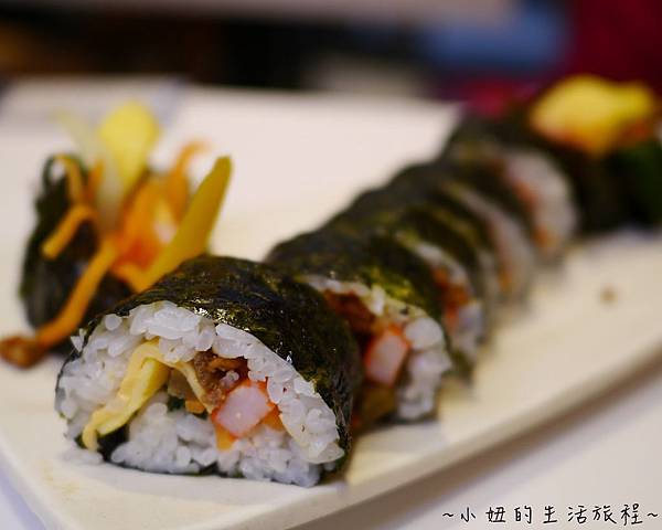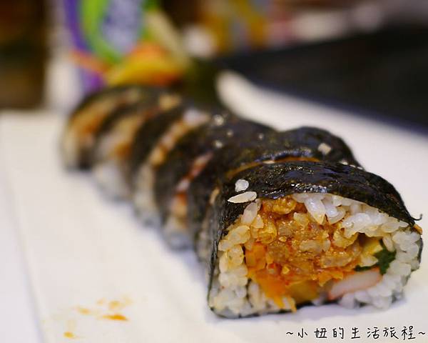 泡菜豬肉飯捲,裡面有泡菜、豬肉和蛋絲,這飯捲味道比較重一些
