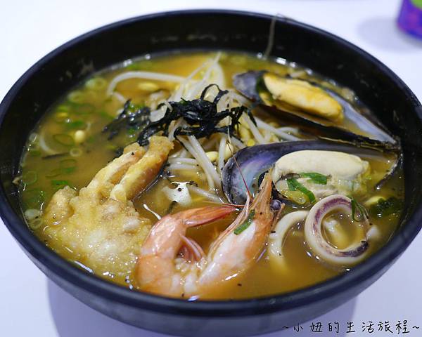 另一位朋友點的海鮮拉麵(不辣),裡面有淡菜、花枝、蝦子和炸螃蟹