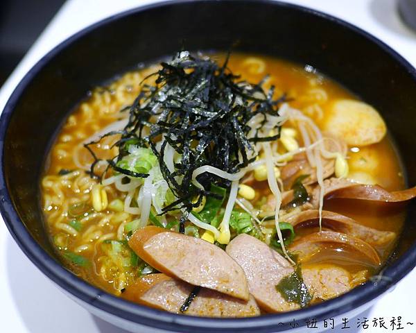 這裡的拉麵除了招牌白年糕拉麵不辣以外,其餘的拉麵都可以選擇辣與不辣,妞媽因為平常吃小辣,所以點了部隊鍋(小辣),裏頭有火腿、年糕、豆芽等配料,