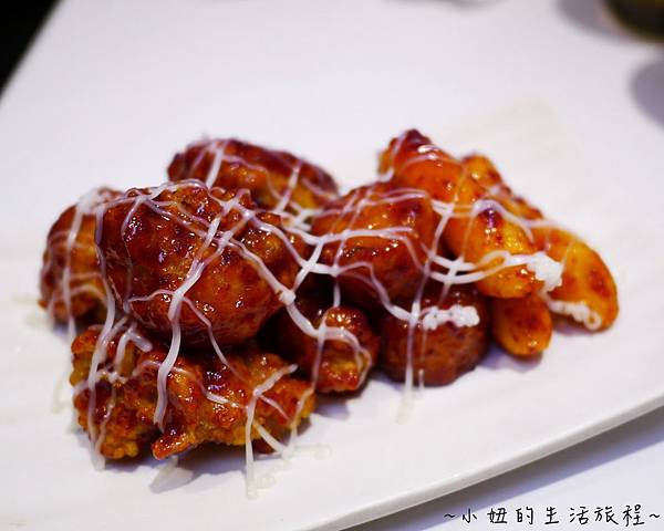 韓式炸雞(醬味),這道菜很特別喔!左邊是炸雞、中間是炸薯餅、右邊是炸年糕,一道菜有三種享受,炸雞嚐起來外酥內嫩,咬下去還有肉汁,妞媽喜歡這一道