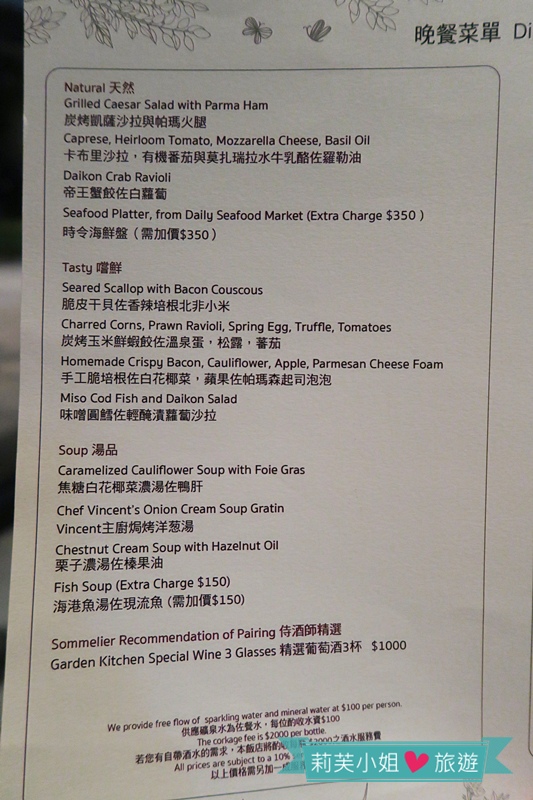 水資的部分每個人100元,提供義大利礦泉水或是氣泡水兩種。接下來就準備開始享受今晚的餐點,老饕牛排與伊比利豬套餐。花園廚房替每道餐點取了極為雅致的名稱,括號後方則是我翻譯成一般人通用的形容詞。