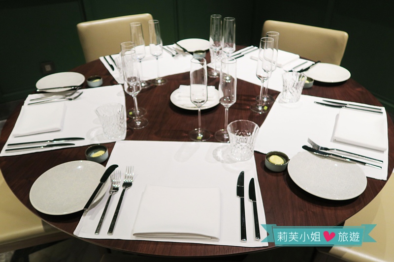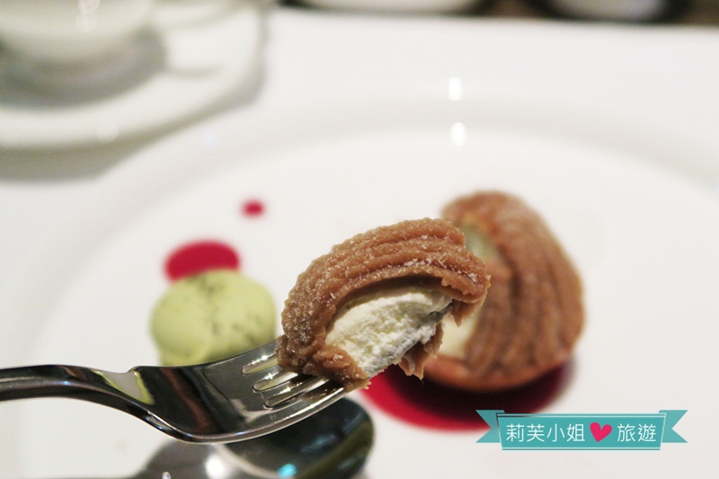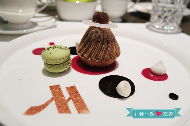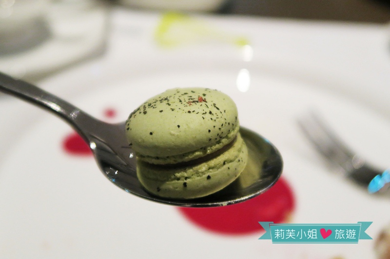 前一道甜點已經讓我們很喜歡,想不到這份栗香蒙布朗佐黑醋栗凍表現得更好。極美的擺盤就像一份藝術品般,栗香蒙布朗塔的餅皮相當酥脆,栗子的香氣四溢,在口中逐漸畫開來。一旁的黑醋栗凍是個完美的配角,微酸微甜的滋味很受我的喜愛,還有小巧可愛的蛋白霜跟一口吃的抹茶馬卡龍。另外,有注意到以玫瑰金烙印的LOGO嗎?