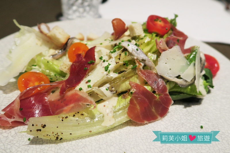 選用翠綠的美生菜,搭配醃漬過的帕瑪火腿、起司和麵包丁,味道甚好。