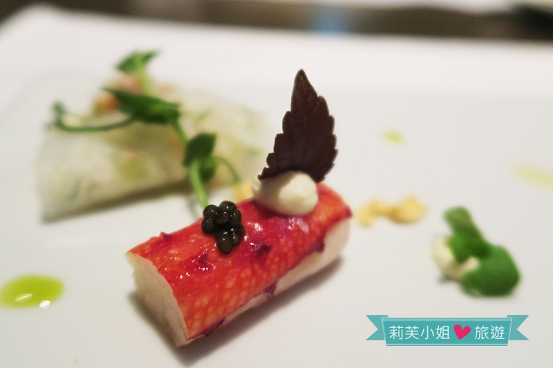 擺盤的美感相當見仁見智,我倒是希望能將食物集中一點放置。主角帝王蟹其實相當不醒目,反而是便宜的蟳肉棒占了最佳位置。將白蘿蔔切片移開,才看到少許的帝王蟹。可能是份量真的太少,還來不及感受帝王蟹的鮮美就已經到喉嚨的位置被吞嚥下肚。對了,完全找不到「餃」,不懂菜名為什麼要誤導我?